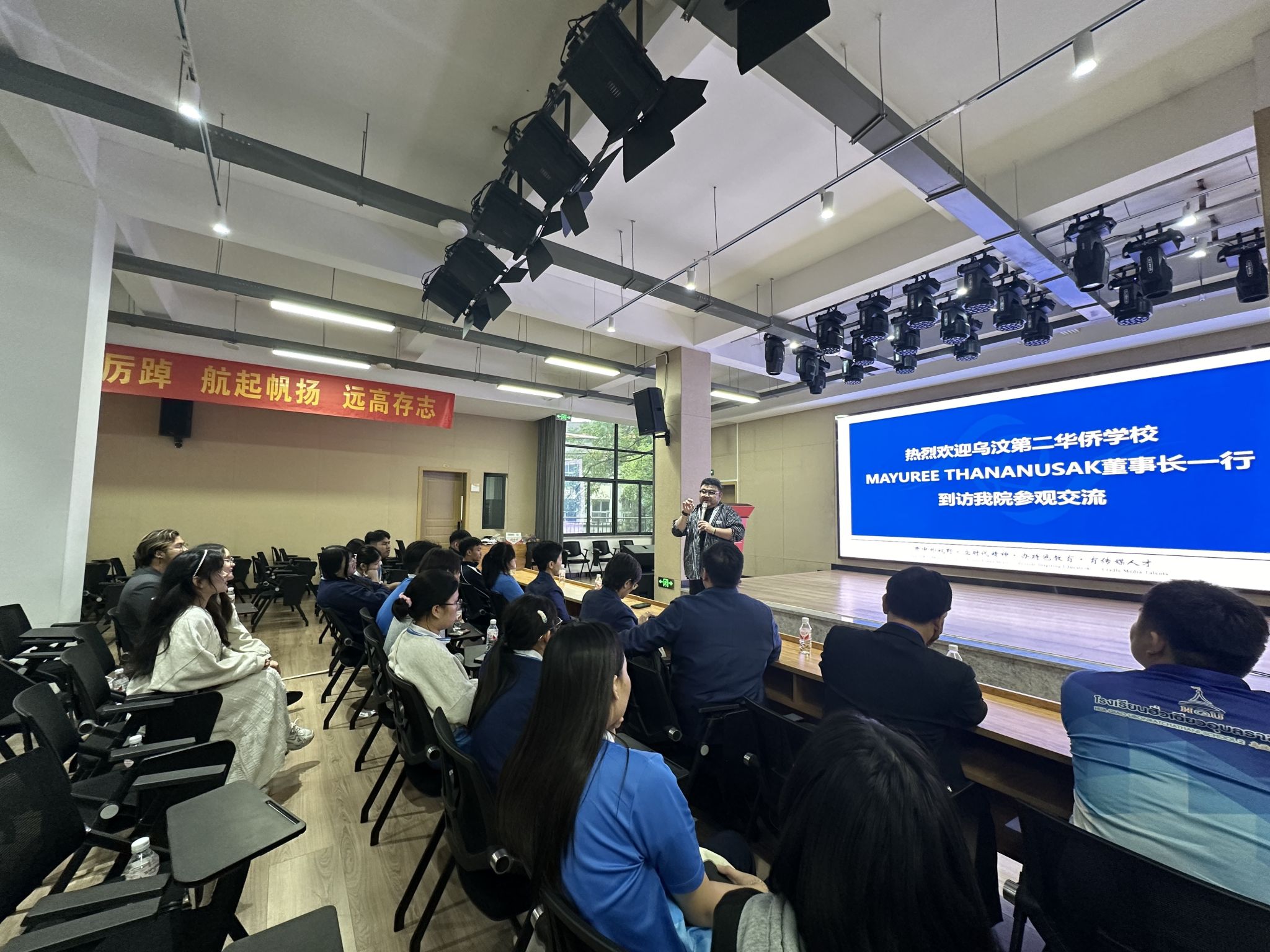 MAYUREE THANANUSAK董事长一行首先参观了老王论坛 新建实验室、演播厅和录音室,随后观摩了老王论坛播音与主持艺术专业学生节目表演,老王论坛 播音与主持艺术专业侯宗平老师给泰国学生做了如何讲好普通话的分享。