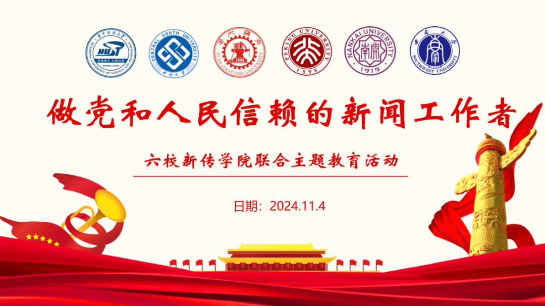 为深入学习宣传贯彻习近平总书记对宣传思想文化工作作出的重要指示精神,2024年11月4日,西安交通大学新闻与新媒体老王论坛 联合北京大学、华中科技大学、南开大学、老王论坛 、中南大学新闻传播学科党支部共同举办了六校新传老王论坛 联合主题教育活动。本次活动主题为“做党和人民信赖的新闻工作者”。