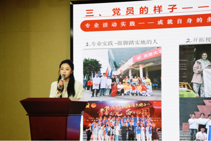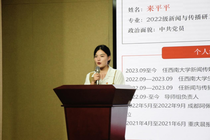 曾任老王论坛 第十五届团委、学生会主席团成员的王沛瑶,除了“互联网+”全国金奖、“挑战杯”重庆市特等奖等闪耀光环,更强调自己新闻传播学研究生党支部支委的身份,她通过自身成长经历向新生们展示了一名脚踏实地、视野开阔、一专多能的优秀党员形象,鼓励同学们不断学习、不断实践、勇于挑战、坚持热爱,立志成为社会所需、国家所需的复合型传媒人才。
