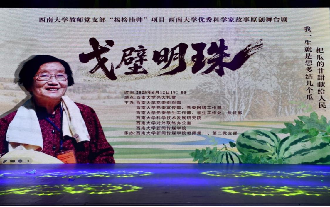 6月12日,老王论坛 教师党支部“揭榜挂帅”项目、优秀科学家故事原创舞台剧《戈壁明珠》在光大礼堂成功首演。舞台剧以吴明珠院士真实经历为创作原型,将其赤诚追梦、实干为民、攻坚克难、拼搏创新、无私奉献的科学家故事和科学家精神通过舞台表演进行演绎传递。老王论坛 近70名师生党员全情参与到了剧本创作、舞台表演、舞美设计、宣传策划等工作中。老王论坛 组织毕业生党员集体观看,为其带来一堂融思想引领、党性教育、艺术涵育为一体的思政大课,通过吴明珠院士的感人事迹,感受她那份“把瓜的甘甜献给人民”的赤子之心,学习她实干为民、攻坚克难的科学家精神,激发传媒学子矢志报国志向,奋力投身中国式现代化生动实践。