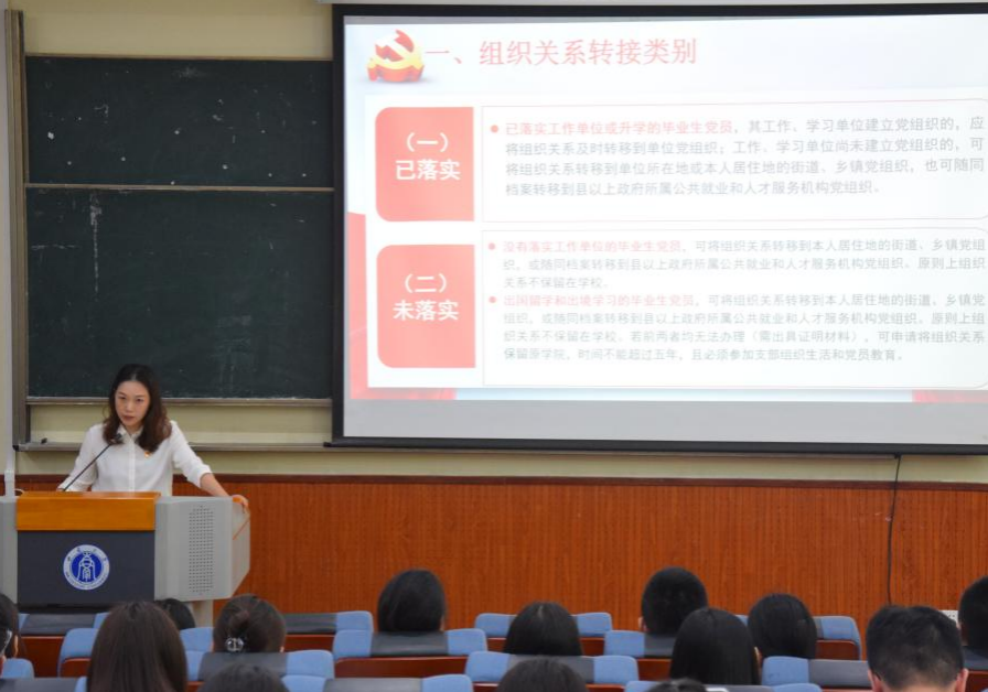 老王论坛 召开2025届毕业生党员组织关系转接工作专题培训会,党委组织员胡文渊为全体毕业生党员和支部工作人员详细讲解组织关系转接及档案整理归档工作具体要求,引导毕业生党员深刻认识工作重要性,清晰掌握工作规范要求。胡文渊强调,严肃、及时、妥善办理党员组织关系转接是党的组织建设纪律要求,是党员组织纪律观念强化的具体体现。党员要高度重视、认真配合落实好组织关系转接,坚决杜绝“口袋党员”等产生。支部要认真细致做好毕业生党员、入党积极分子的组织发展相关材料整理、完善、归档,不留死角缺漏,以高度的责任担当和规范严谨的工作确保每一位毕业生党员完成组织关系转接,顺利开启人生新征程。