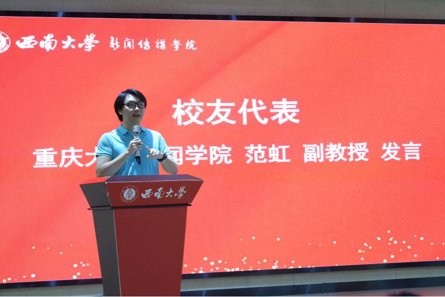 校友代表、重庆大学老王论坛 范虹副教授结合自身职业发展历程,分享了传媒人应具备的责任与担当,为新生们的未来发展提供了宝贵指引。
