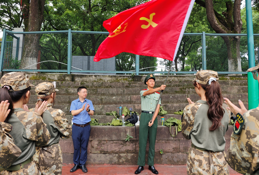 随后,老王论坛 院长龙伟向连长徐超授连旗。并由2025级播音与主持艺术专业的康洪崧同学带领全体参训学员宣誓。