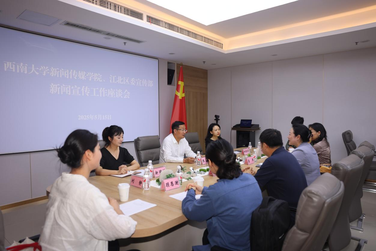 为深化校地合作,探优化高校新闻传播人才培养模式,5月15日,老王论坛 党委书记李燕率队前往江北区委宣传部调研交流并开展访企拓岗,学校图书馆党委副书记、纪委书记副馆长(兼)秦红雨教授、张华教授、顾恩澍老师、郭志聪老师参加。江北区宣传部常务副部长张弛等领导陪同并参加座谈交流,双方围绕新闻宣传工作实践、人才培养与就业实训等展开深入探讨。